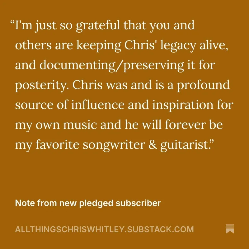 I’ve never sought to monetize my passion for all things Chris Whitley, and I don’t plan to begin doing so now. Subscribe for free! And please let me know what you like/don’t like about this site. Also please suggest features, content, capabilities you think would improve our community.