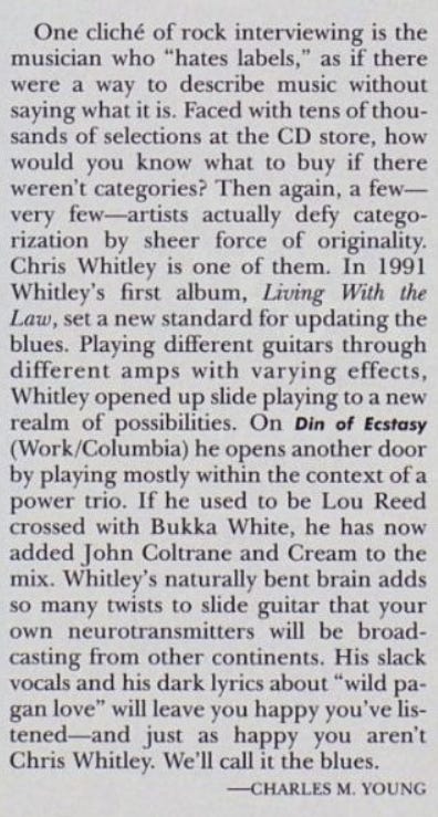 Clearly, many (most?) music critics didn’t know how to classify Chris’ music, which box to put him in. Consider some titles of articles written about Chris: