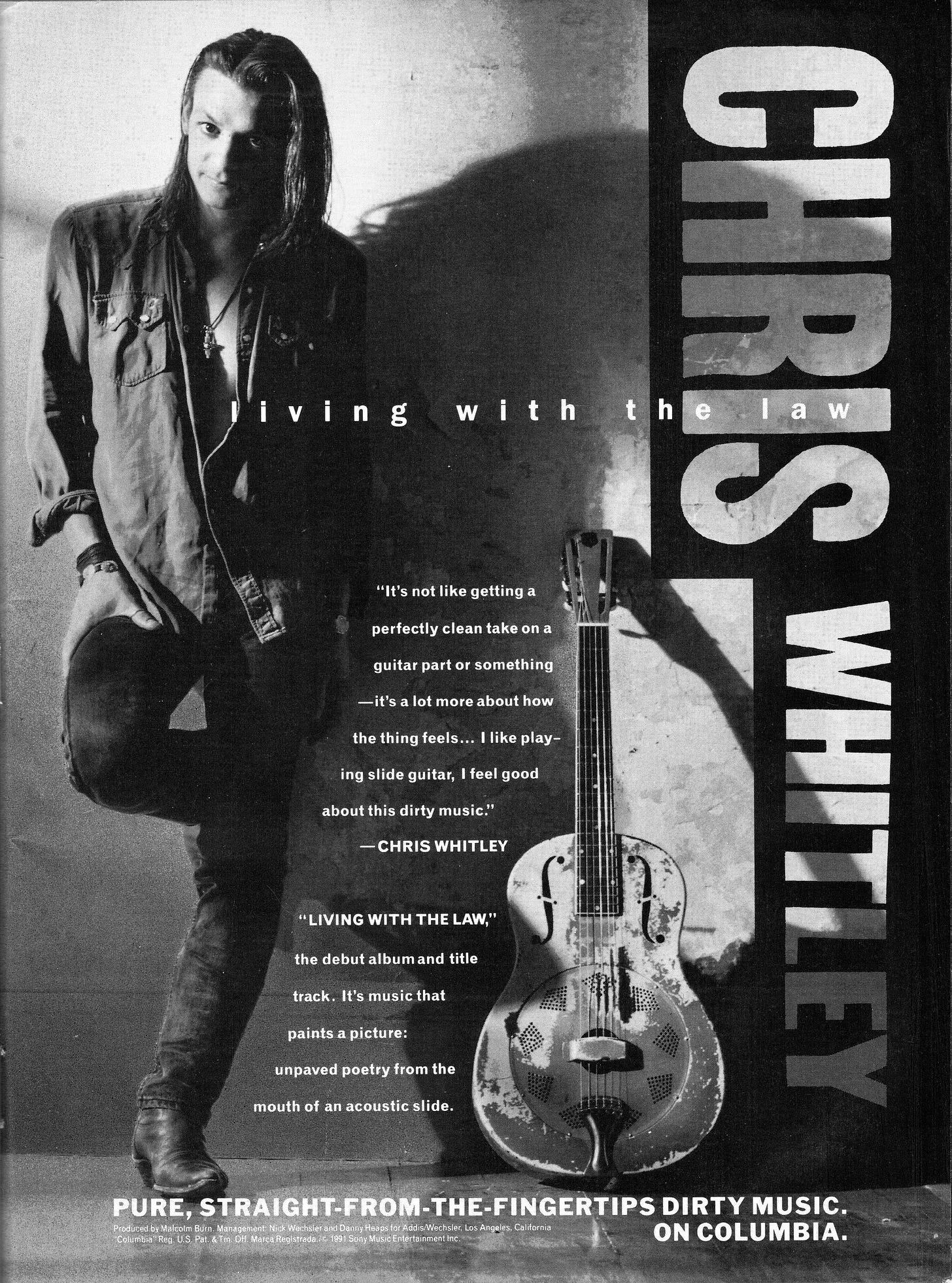 Chris also rejected the singer/songwriter, Americana, rootsy pigeon-hole that he was stuck in. Singer/songwriter? "It's self-important. You can play something in a way that it gets corny. I combat that in myself a lot because I feel like I write romantically, which is always melodrama on a certain level." [Press of Atlantic City, August 7,1995] Rootsy? "I feel more -- I dunno -- acid-rock. .... I guess everyone needs a reference point ... I guess I do sound old-fashioned when compared with Paula Abdul." And the to-die-for Time article? "Man, to be honest, that Time thing bothers me. .... Fuck, that guy should have listened to the record." [Graham Reid, "CHRIS WHITLEY INTERVIEWED (1991): The Law man living with the lore," May 24, 2010 on Elsewhere]