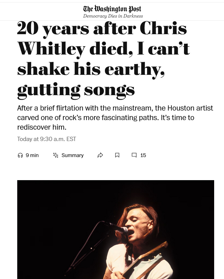 WaPo CW article live!Tim Carman's retrospective might ignite some interest?KatieNov 20, 2025∙ Paid1410ShareIt’s a thing! When was the last time any major outlet wrote about Chris? TODAY!https://www.washingtonpost.com/entertainment/music/2025/11/20/chris-whitley-legacy/Thanks for reading All Things Chris Whitley! Subscribe for free to receive new posts and support my work.SubscribeContinue reading this post for free, courtesy of Katie.Claim my free postOr purchase a paid subscription.PreviousNext